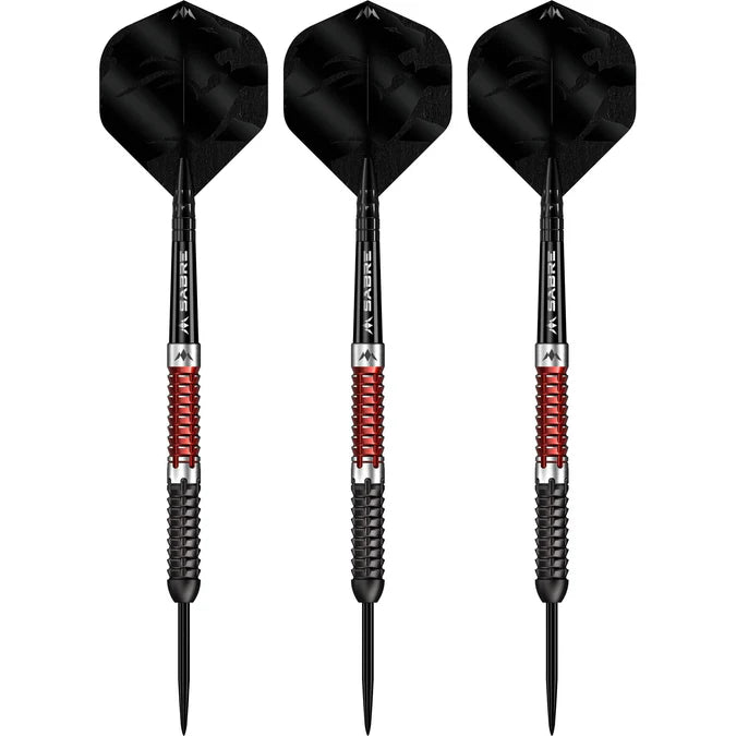 Mission Llew Bevan Darts - Steel Tip - 90% Tungsten - Black & Red Electro - 21g. Become a record breaker on the dartboard with the Mission Llew Bevan Tungsten Darts. In 2021, Bevan set a new Guinness World Record with the fastest time to complete a game of ‘round the clock’ in a time of 1 minute and 19.79 seconds. Bevan’s first set of signature darts from Mission are made from 90% tungsten. This straight barrel dart has two sections of horizontal milled cuts with radial grooves, one at the front in a black PVD coating and one at the rear in a red PVD coating. There are two small smooth tungsten sections, one in the centre of the barrel and one at the rear that has a laser-etched Mission logo. A smooth black bull nose at the front of the barrel leads to a black point. Bevan’s signature darts are complete with black Mission Sabre shafts with black tops and his own signature flights.