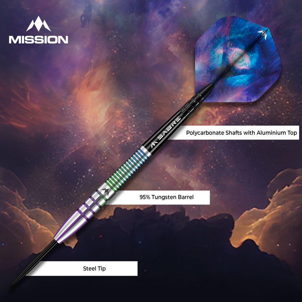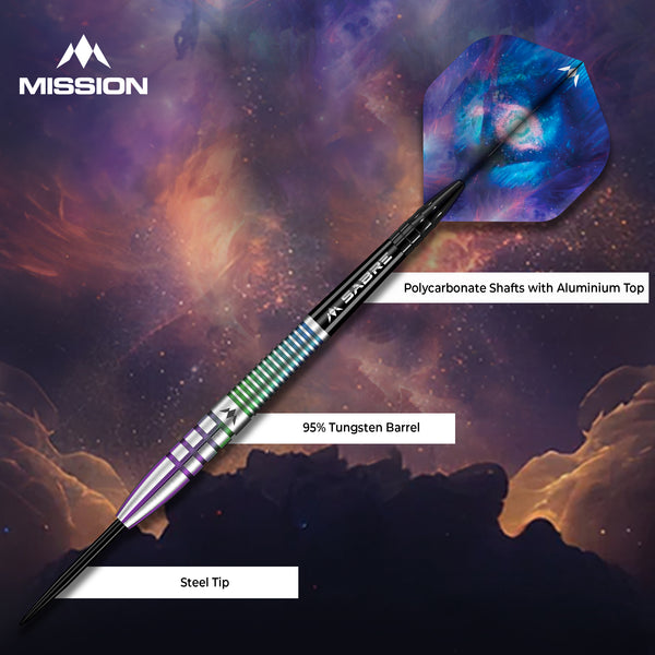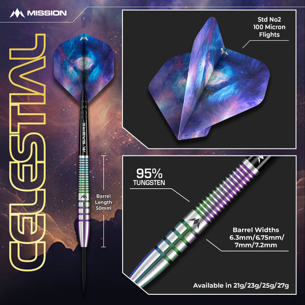 Mission Celestial Darts - Steel Tip - 95% - Coral PVD coating. Embrace an out of this world darting experience with the Mission Celestial Darts. Made from a high grade 95% tungsten material, the Celestial dart is complete with a coral PVD coating to give players a supreme darts setup. The rear section of the barrel includes horizontal milling and tapers naturally to a smooth centre section with a laser-etched Mission logo. A section of wider radial grooves then leads to a radial nose that tapers to a black point. The Celestial dart is complete with a Mission Sabre shaft in black which tightly grips the flight. The Mission Celestial flight includes a visually striking outer space-themed design. Available in a choice of weights in both steel tip and soft tip.
