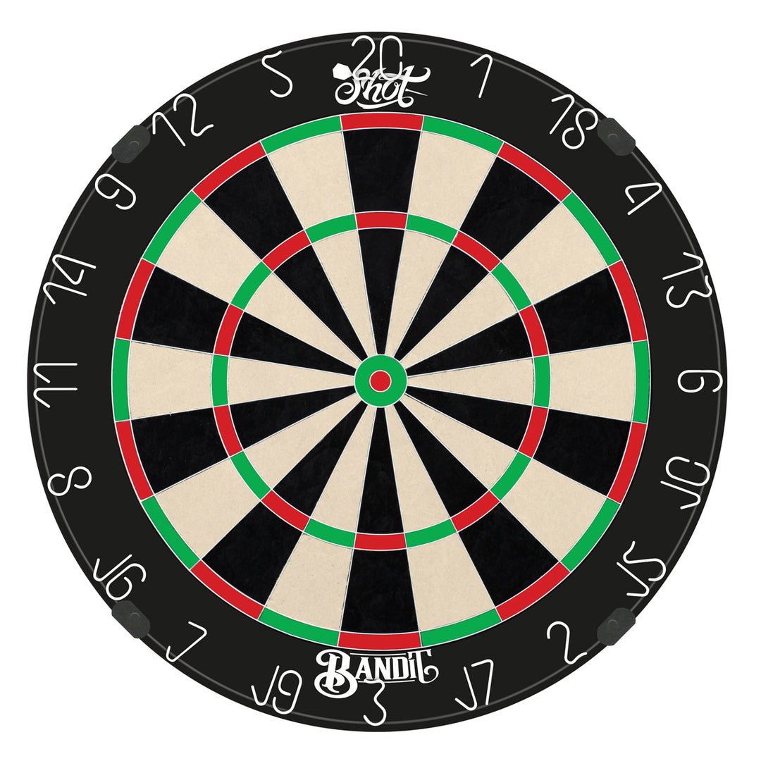 Shot Darts Bandit Generation 4 dartboard is a game-changer. Its embedded one-piece stainless steel bullseye combines precision machining with high tensile strength to resist bending and ensure long-lasting durability. The inner bullseye chamfer design directs darts into the bull area, enhancing scoring accuracy. With its premium African sisal fibers, advanced wiring system, and unique bracket system, the Bandit dartboard stands out as an exceptional choice for both recreational and competitive players. Elevate your game with the Bandit Generation 4!