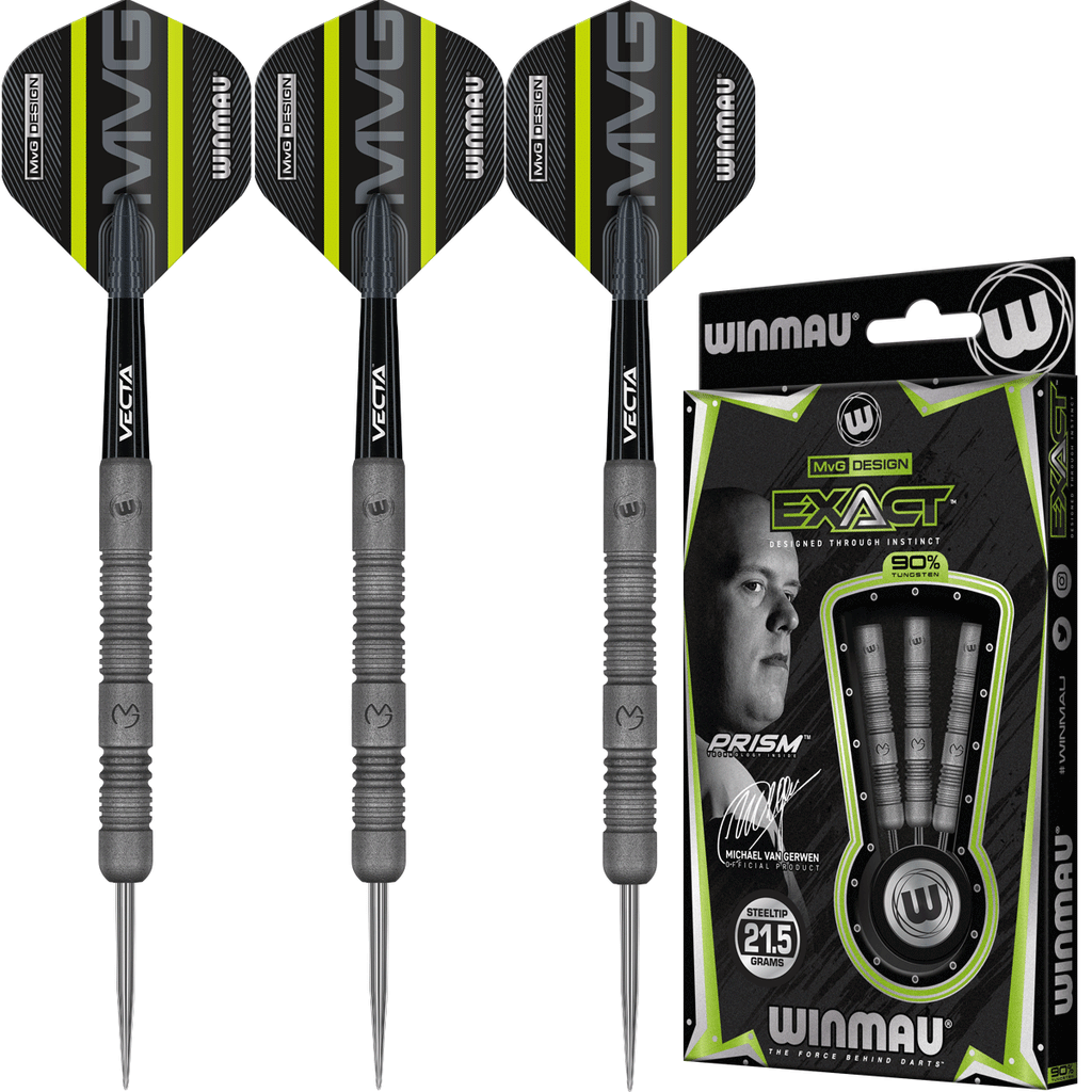 MvG Exact darts are testament to Michael's extreme passion and drive for perfection. Featuring precision machined diameters with Exact tolerances, hand finished grooves, an atomised surface for a unique 'soft' feel and made to the Exact specific weight and balance as used by MvG to perform in the world's biggest arenas.